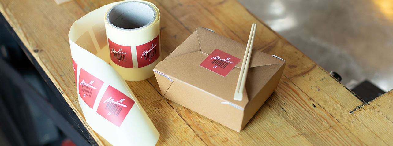 La experiencia de los clientes cuando reciben tu comida es importantísima. Pon etiquetas con tu marca en las bolsas de papel básicas y utiliza etiquetas adhesivas personalizadas para cerrar los envases de la comida para llevar. Además, no te olvides de añadir la carta, un flyer o una postal a las bolsas de las entregas a domicilio con noticias sobre las próximas ofertas y promociones, datos de entrega a domicilio actualizados o incluso la historia de tu negocio.