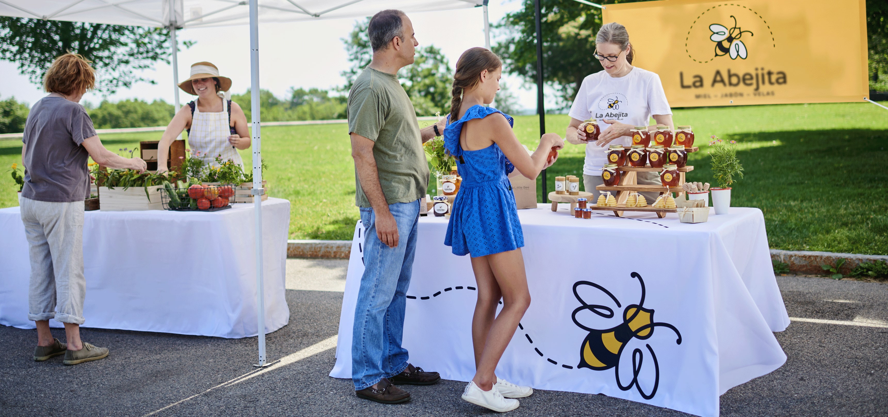 Al crear materiales a gran escala para tu puesto en el evento al aire libre, utiliza diseños sencillos. La gente suele distraerse y agobiarse fácilmente y tu negocio compite con otros para llamar su atención. La mejor forma de destacar es ofrecer información clara, concisa y fácil de leer de un vistazo. Utiliza lonas, flyers o banderas publicitarias llamativos para atraer a los clientes hacia tu puesto. Para conseguir el máximo impacto, las lonas grandes deben ser claras y sencillas: lo único que tienes que incluir es el nombre y el logotipo de tu negocio. Elige una fuente principal y utiliza unos pocos colores distintivos. Aquí, La Abejita utiliza dos colores (negro y amarillo) que complementan su marca y son fáciles de ver y de leer gracias al gran contraste.