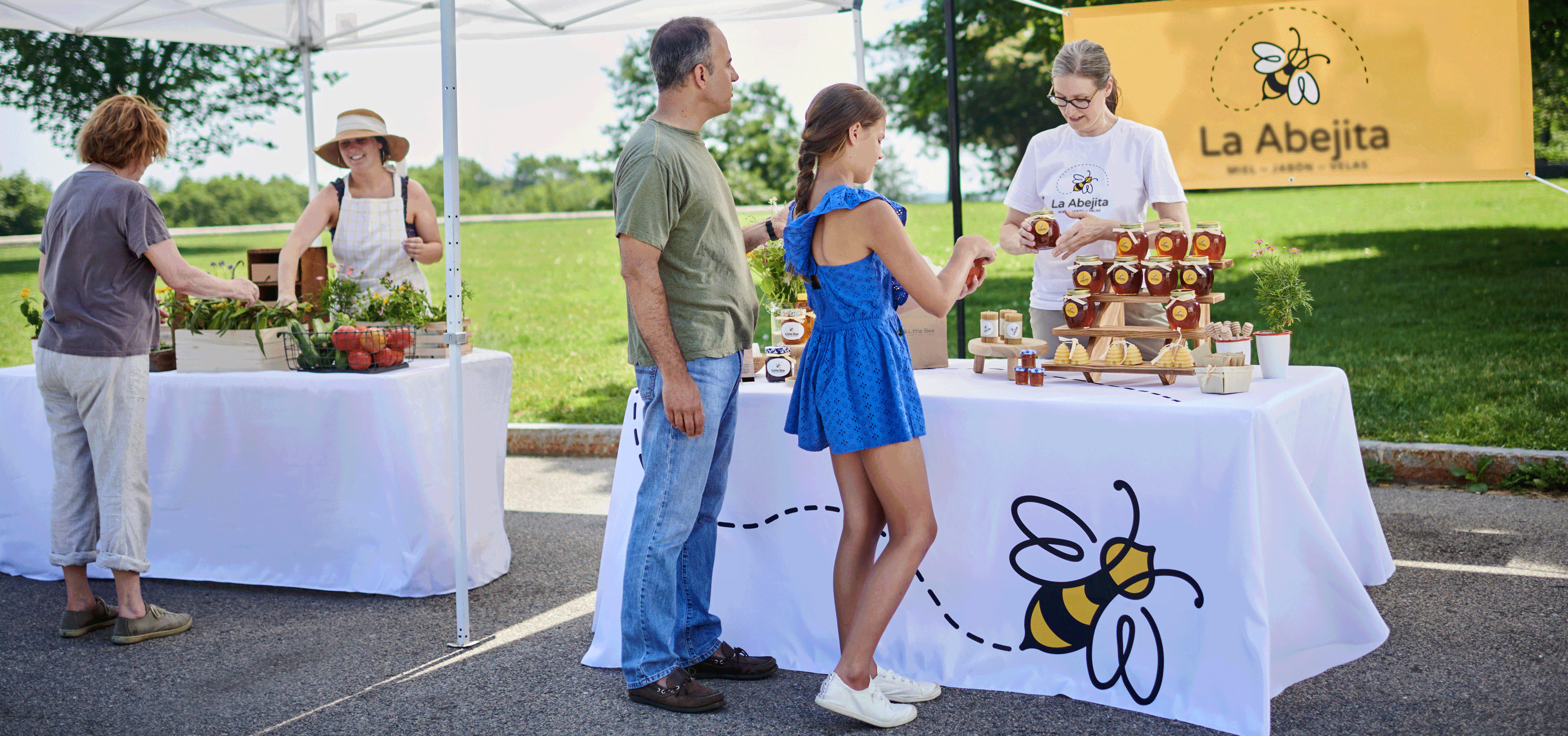 Al crear materiales a gran escala para tu puesto en el evento al aire libre, utiliza diseños sencillos. La gente suele distraerse y agobiarse fácilmente y tu negocio compite con otros para llamar su atención. La mejor forma de destacar es ofrecer información clara, concisa y fácil de leer de un vistazo. Utiliza lonas, flyers o banderas publicitarias llamativos para atraer a los clientes hacia tu puesto. Para conseguir el máximo impacto, las lonas grandes deben ser claras y sencillas: lo único que tienes que incluir es el nombre y el logotipo de tu negocio. Elige una fuente principal y utiliza unos pocos colores distintivos. Aquí, La Abejita utiliza dos colores (negro y amarillo) que complementan su marca y son fáciles de ver y de leer gracias al gran contraste.