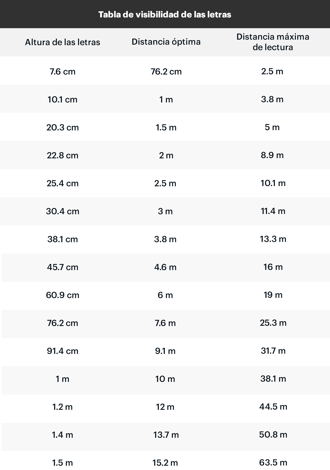 - Altura de las letras. La altura de las letras determinará la facilidad con la que se lee tu cartel: cuanto más altas, más fácil será leerlo a distancia. Esta tabla da una idea aproximada de la altura que deberán tener las letras según la distancia desde la que los clientes lean tu cartel: