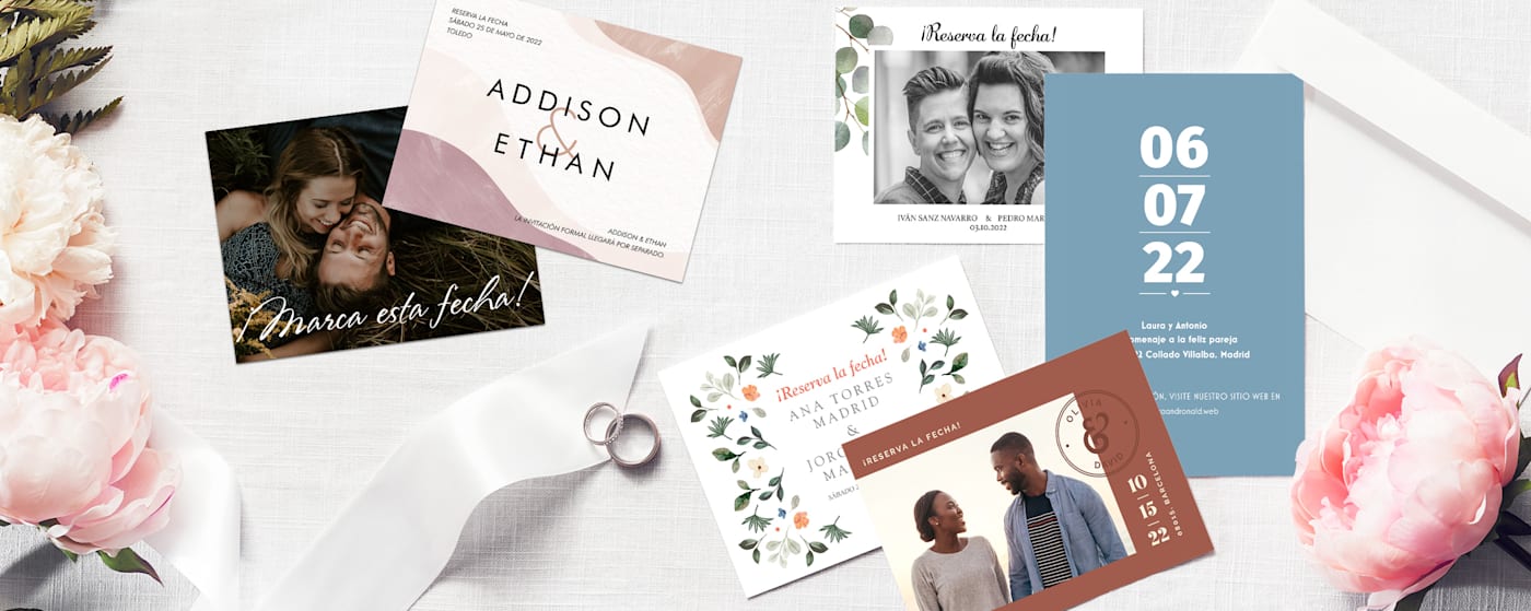 - El estilo de la tarjeta Save the Date. Para crear una tarjeta Save the Date que refleje vuestra personalidad, tenéis infinitas opciones. Por ejemplo, podéis optar por una tarjeta con foto que incluya una instantánea de la pareja o por una tarjeta clásica en la que solo se incluya texto. ¿Queréis aseguraros de que los invitados no se olviden de la fecha? Optad por un imán Save the Date.