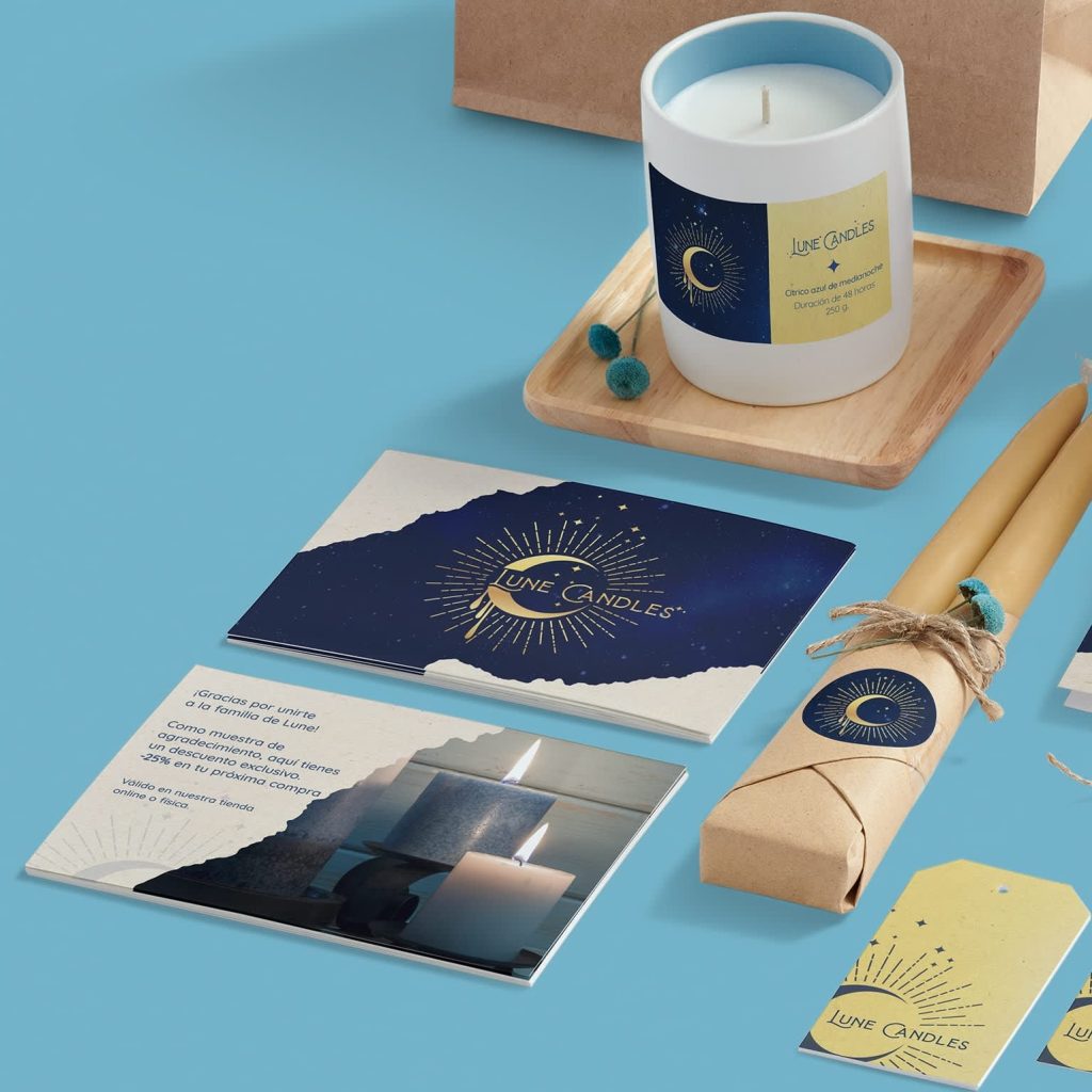 Hay muchos factores a tener en cuenta al elegir los colores de tu marca: ¿quieres utilizar tonalidades cálidas y vivas o prefieres colores fríos y relajantes? Los tonos de azul son perfectos para Lune Candles, ya que hacen referencia al nombre, de inspiración celeste, así como a los ricos colores del cielo nocturno. Esta empresa de velas utiliza distintas tonalidades de azul y combinaciones de sus colores de marca para crear dimensión en su conjunto de artículos de packaging creativo. Gracias a su cohesionada gama de colores, Lune puede combinarlos para crear etiquetas adhesivas, etiquetas colgantes y postales ligeramente distintas, pero con su característica imagen de marca.