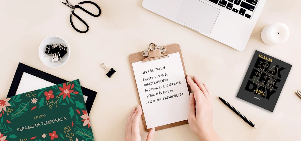 ● Pide los materiales publicitarios. Es el momento perfecto para pedir los materiales de marketing que necesitarás para tus promociones u ofertas navideñas. Tanto si se trata de lonas publicitarias, postales, flyers, pósteres o carteles de cartón pluma, empieza a acumular material para que no te falte de nada durante esta temporada.