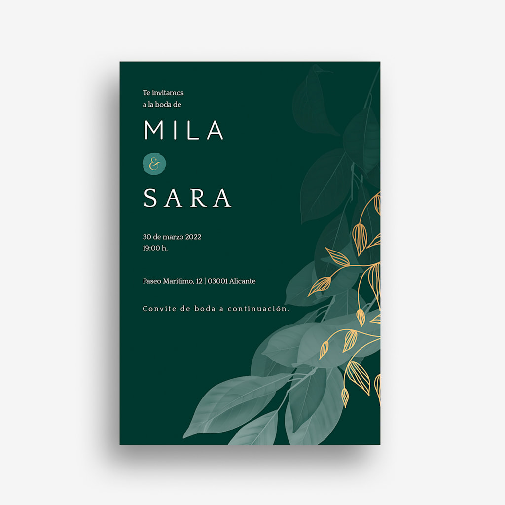 Si en la invitación no caben todos los detalles de la boda, añadid una tarjeta para bodas con la información adicional o indicad a los invitados que consulten la página web de la boda para obtener más información.