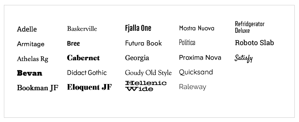 Adelle – Armitage – Athelas Rg – Bevan – Bookman JF – Baskerville -Bree – Cabernet – Didact – Gothic – Eloquent JF – Fjalla One – Futura Book – Georgia – Goudy Old Style – Hellenic Wide – Mostra Nuova – Politica – Proxima Nova – Quicksand – Raleway – Refrigerator Deluxe – Roboto Slab – Satisfy