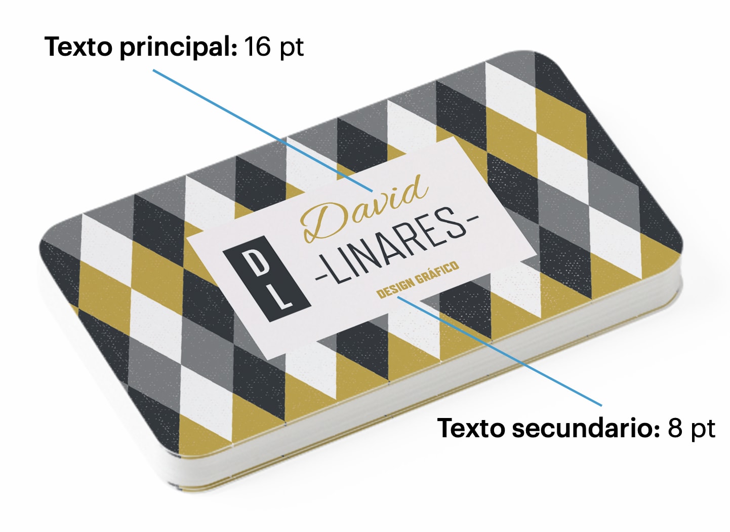 En tipografía, el punto tipográfico (pt) es la unidad estándar para medir el tamaño de las letras de un diseño. Los campos de texto más destacados de la tarjeta de visita, como el nombre de tu empresa o tu nombre y apellidos, deben tener un tamaño entre 10 pt y 16 pt, en función del espacio disponible.