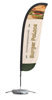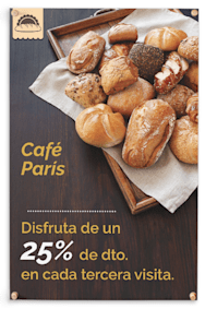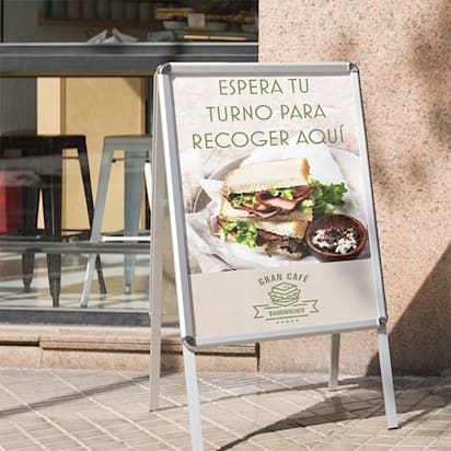 Todas las personas que pasen a pie o en un vehículo por delante de tu restaurante son clientes potenciales. Asegúrate de captar su atención con una lona de vinilo, un póster o una banderola además de la cartelería permanente de tu restaurante. Si tienes previsto utilizar un cartel en la acera, consulta la normativa local sobre la colocación de carteles en exteriores. Al diseñar este tipo de carteles para restaurantes y cafeterías, te recomendamos que incluyas una oferta tentadora para captar clientes. Ofrecer un descuento es una forma excelente de crear expectación en torno a tu negocio, tanto si se trata de pizzas a mitad de precio los miércoles como de envío gratis para nuevos clientes.