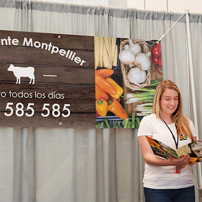 Utiliza lonas y pósteres como herramienta de promoción de marca para reforzar la identidad de tu restaurante o crear ambiente. Desde la tipografía de los roll-ups de mesa hasta los colores de la banderola, diseña tus lonas y pósteres de forma que reflejen tu identidad de marca.