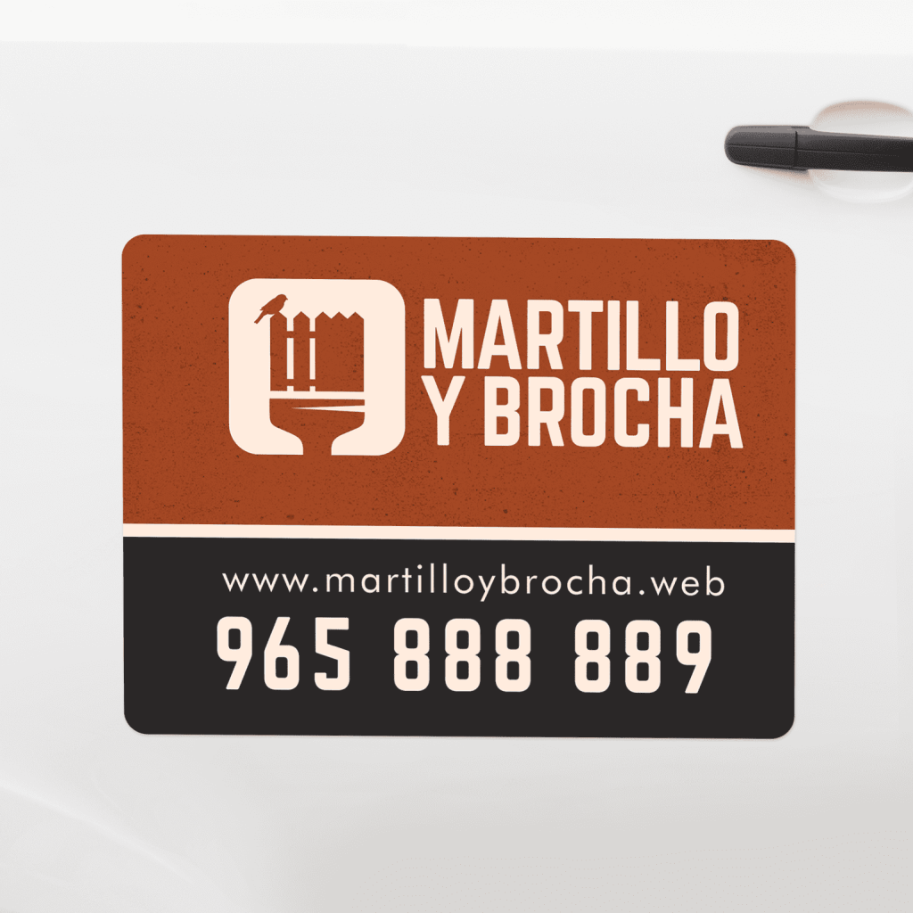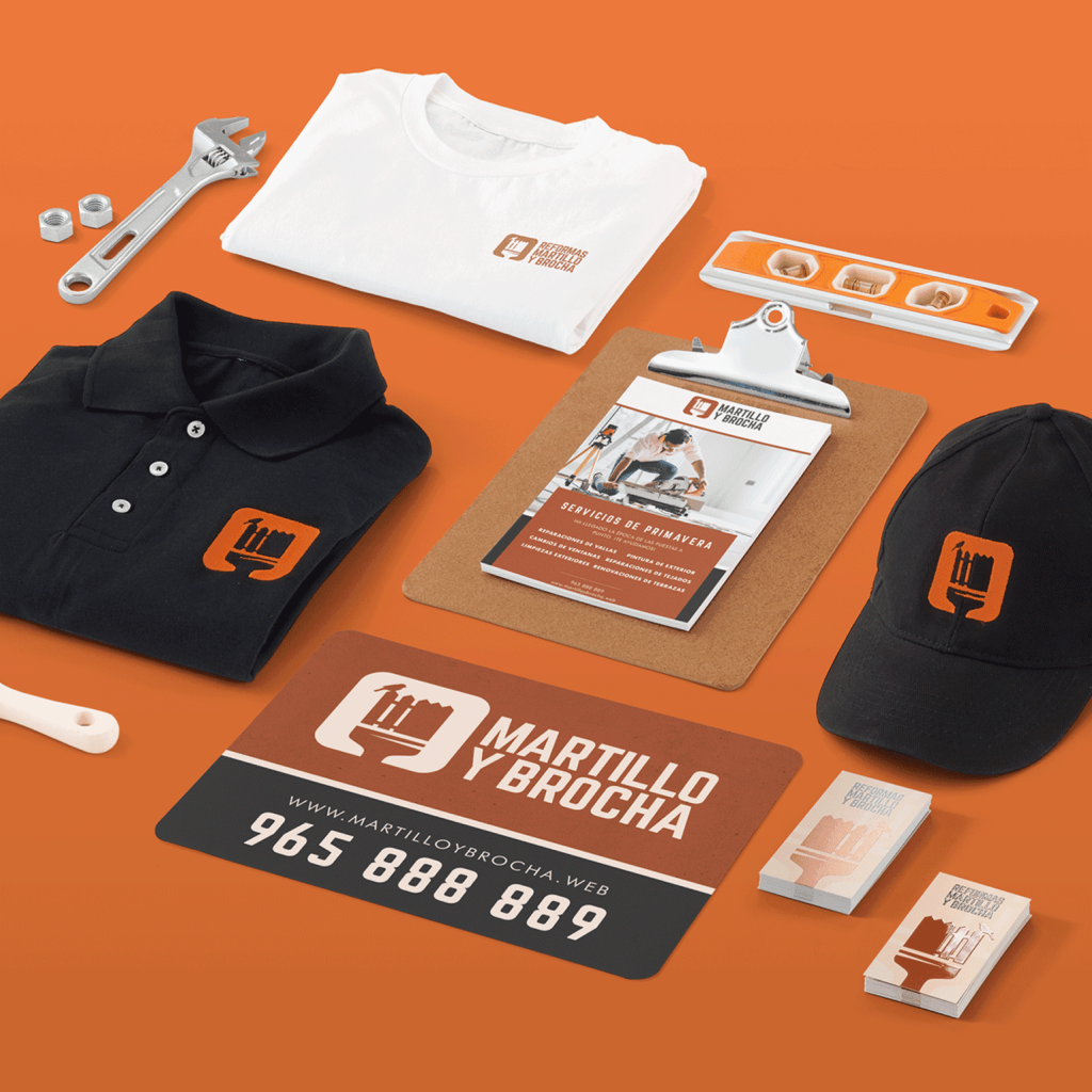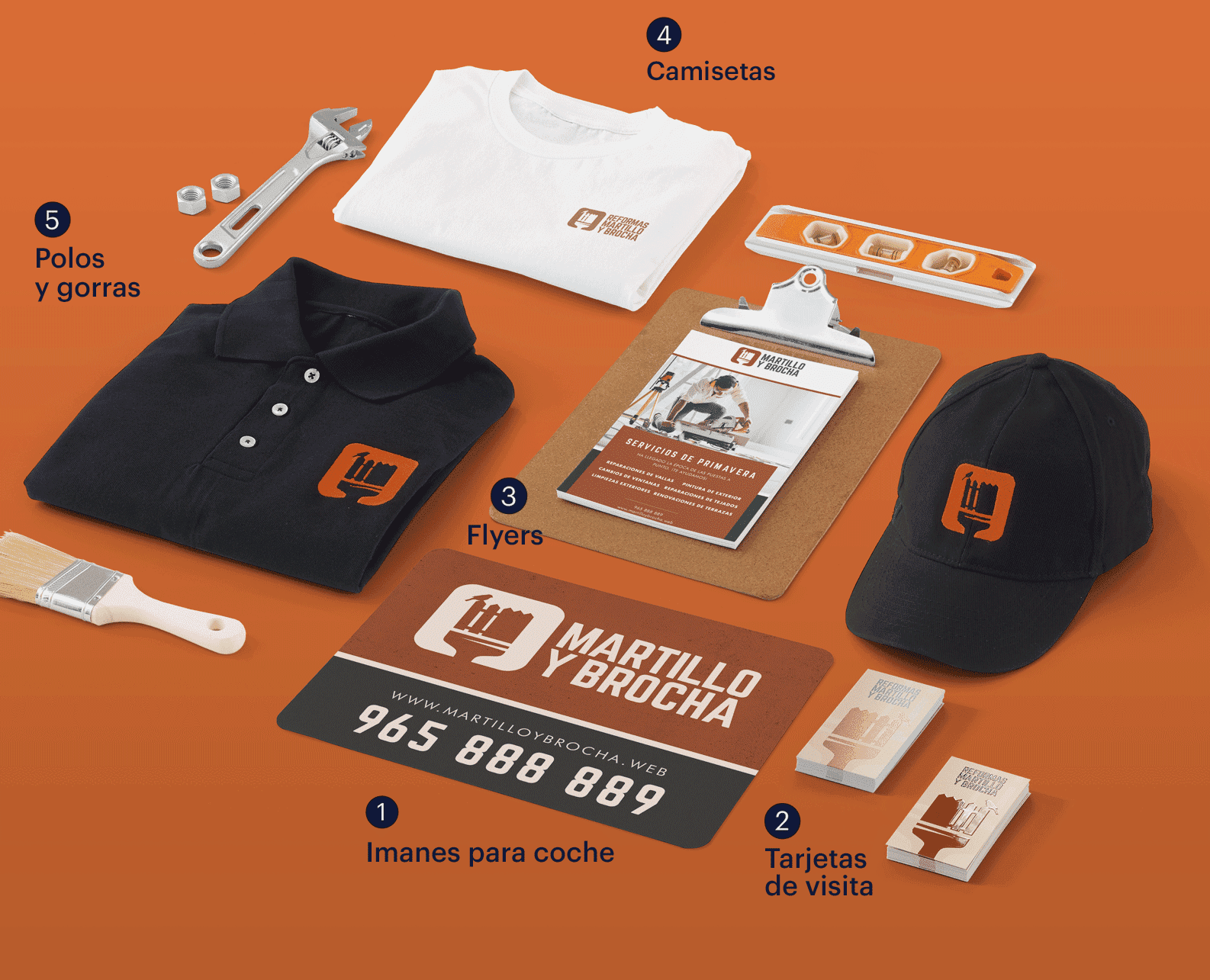 Más allá de los colores del logotipo, a la hora de diseñar imanes para coche, flyers y carteles para exteriores, utiliza colores de gran contraste, de forma que queden estupendos desde la distancia. Aquí, Martillo y Brocha utiliza en sus materiales ricos matices blanquecinos, negros y naranja para crear un efecto de contraste en dos tonos con el máximo impacto, tanto desde cerca como desde lejos. Además de verse estupendamente desde lejos, la gama de colores de Martillo y Brocha refleja a la perfección la marca: el color principal es un tono anaranjado inspirado en el óxido que transmite una sensación de tranquilidad y fiabilidad, sobre todo cuando se combina con tonos básicos, como el blanco y el negro. En sus gorras y polos personalizados de color negro, el logotipo está bordado en un tono de naranja más vivo, para que el contraste sea mayor.