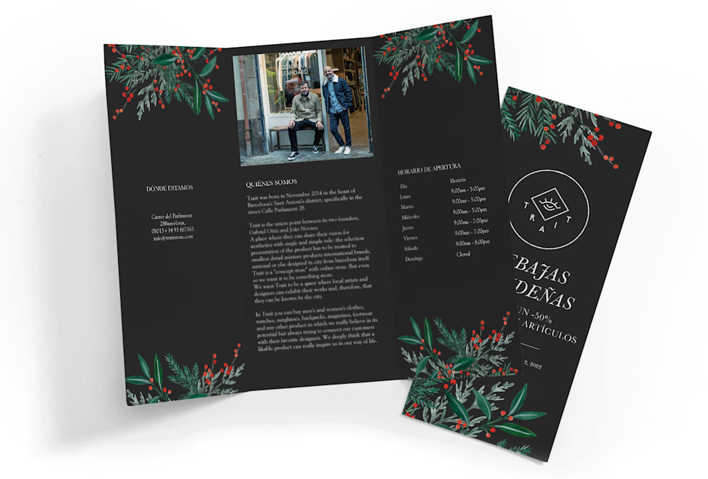Luego, da a conocer tu oferta especial por Navidad con un folleto. Los folletos no solo se pueden exponer en comercios físicos, oficinas u otras ubicaciones, sino que los puedes enviar a posibles clientes y repartirlos a los compradores.