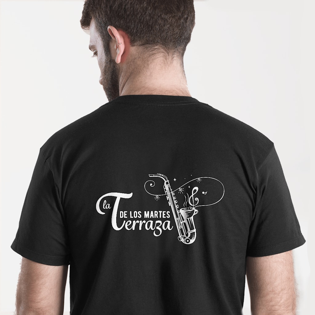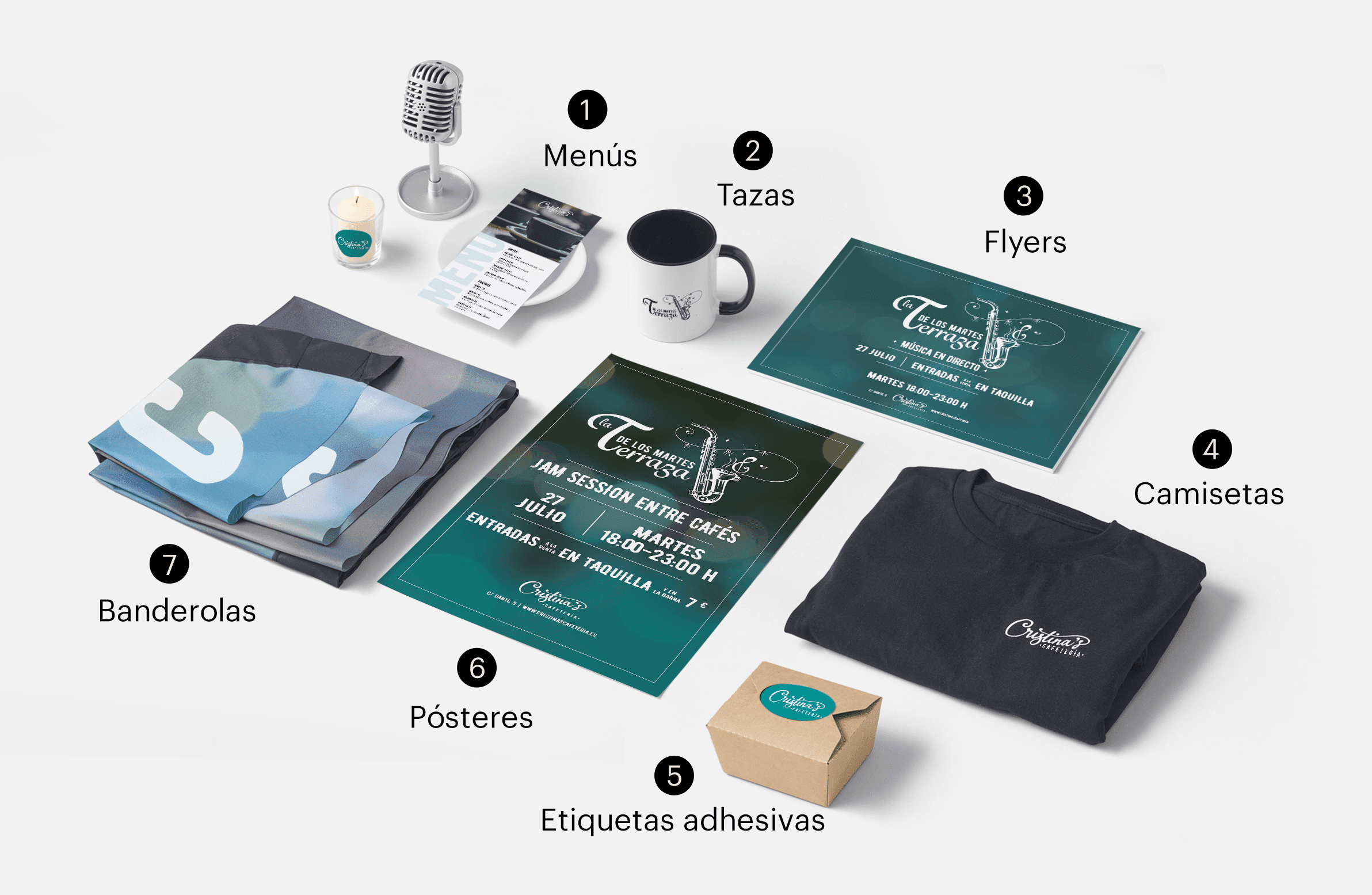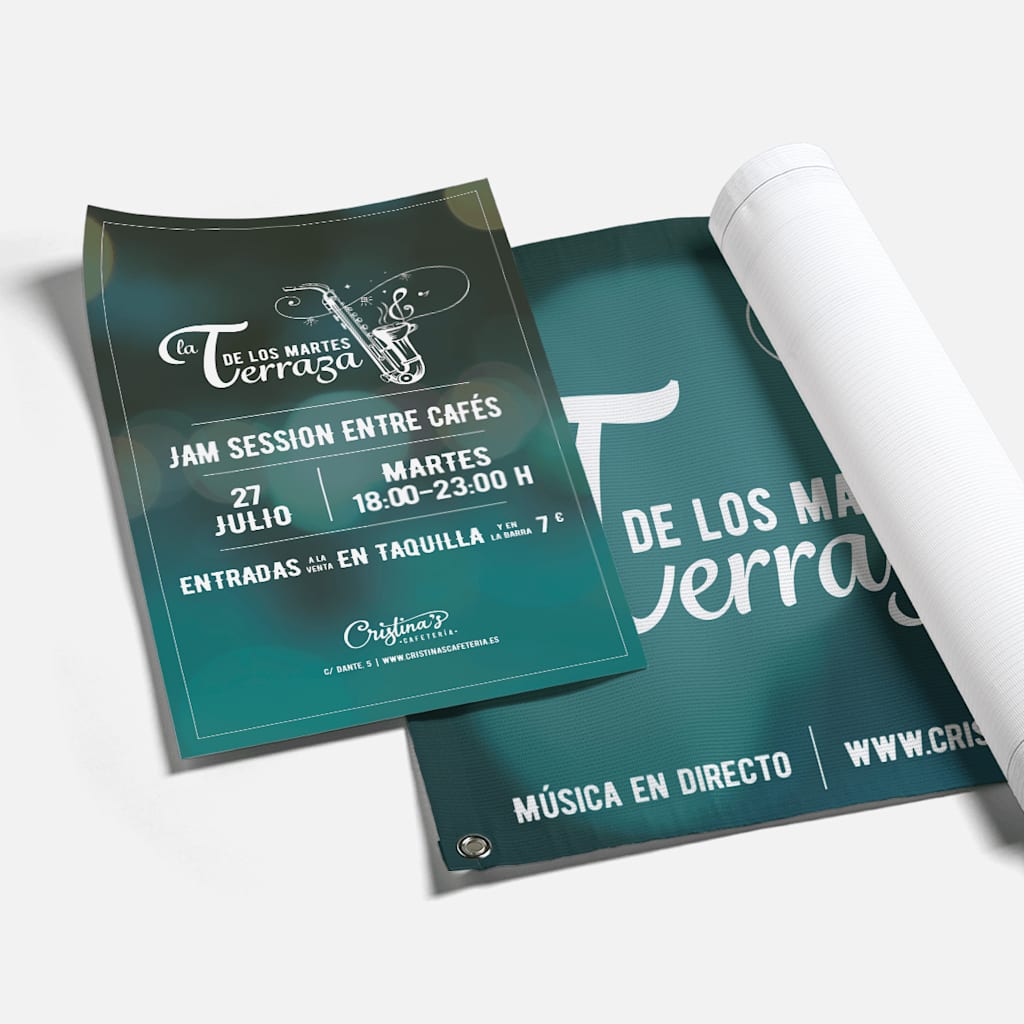 Los logotipos de Cristina’s Cafe y Tuesdays on the Terrace utilizan fuentes similares, que parecen escritas a mano. Para que la imagen publicitaria del evento se diferencie, le han dado un poco de «vidilla» al nuevo logotipo con una ilustración de un saxofón con notas musicales flotando y una taza de café humeante. Este nuevo logotipo ofrece información sobre el evento, para que los clientes sepan que va a haber música en directo y café.