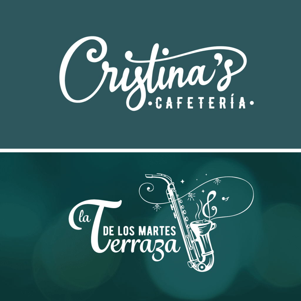 Ambos diseños también utilizan colores de la misma familia para complementarse. El logotipo de Cristina’s Cafe está sobre un fondo liso de color verde azulado intenso, un tono perfecto para una cafetería animada. El logotipo del evento utiliza un tono más oscuro de verde azulado para reflejar que se celebra por la noche. Además, se le ha aplicado un efecto inspirado en focos de luz para dar una sensación de volumen.
