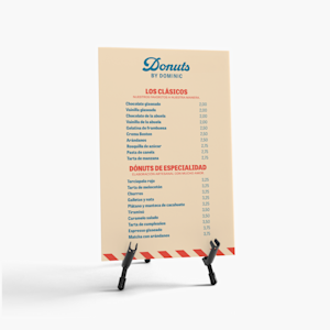 No te limites a presentar una lista de tus platos y haz que destaquen de verdad. Opta por la impresión a doble cara para dar protagonismo a tus especialidades y promociones, o incluso para añadir alguna bebida. Los menús de cartón pluma no solo quedan genial, sino que además son fáciles de personalizar y muy sencillos de colocar. Añádeles agujeros para colocarlos donde quieras, desde mesas hasta la pared, y pónselo fácil a tus clientes.
