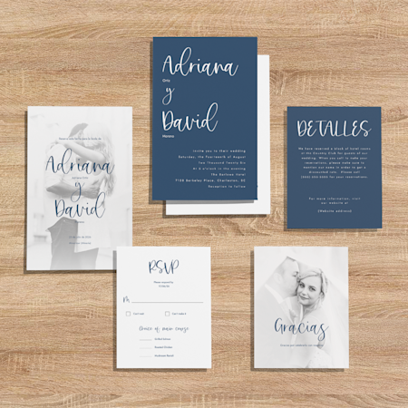 Para empezar, echa un vistazo a nuestras invitaciones. Elige un diseño y personalízalo con la fecha, el lugar de la ceremonia, los detalles del banquete y mucho más. Podrás trasladar el mismo diseño a otros artículos relacionados con tu boda, como las tarjetas de respuesta o los insertos. También puedes ponerte en contacto con nuestro equipo: si has encontrado un modelo que te gusta, ellos se encargarán de combinar los elementos gráficos y crear un conjunto completo de artículos de papelería para tu boda. ¿Quieres algo más ecléctico? No tengas miedo de combinar artículos esenciales de papelería a tu gusto para crear una imagen divertida y moderna.