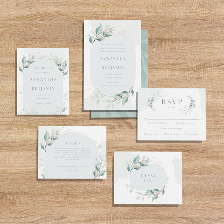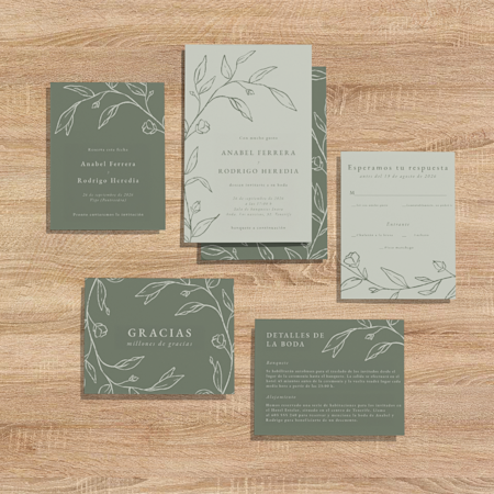 Un conjunto clásico de papelería de boda consiste en una tarjeta Save the Date, la invitación de boda y una tarjeta para boda o de respuesta. Si quieres dar a los invitados la opción de confirmar su asistencia digitalmente, incluye un código QR en la invitación que enlace directamente con la página web de tu boda.