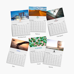 ¿Has encontrado una temática que te llame la atención? Escoge entre 6 diseños profesionales, con imágenes de naturaleza para las marcas de bienestar o de transporte para los equipos logísticos, entre otras. Cada temática mantiene una imagen uniforme a lo largo de los 12 meses. Solo tienes que añadir tu logotipo, escoger la cantidad y te enviaremos tus calendarios listos para que los cuelgues.