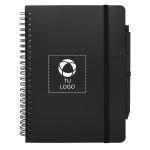 Captura tus pensamientos e ideas con esta libreta de tapa dura con páginas pautadas de color crema, cierre elástico y un bolígrafo a juego. Ideal para llevar a reuniones, tomar notas o dibujar sobre la marcha, esta libreta te permite organizar tu creatividad y tenerla a mano allá donde te llegue la inspiración. Es muy fácil de personalizar: solo tienes que añadirle tu logotipo, mensaje o información con nuestro estudio intuitivo. ¿Necesitas ayuda? Nuestros expertos en diseño están aquí para ayudarte a dar vida a tus ideas.
