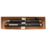 Crea una impresión duradera con este kit de regalo refinado que combina estilo y funcionalidad. Este dúo ofrece una presentación elegante y un rendimiento fiable. El kit incluye un bolígrafo retráctil y un bolígrafo de gel con tapa, ambos fabricados en plástico reciclado con un acabado texturizado de piedra y acentos en bronce cálido. Ideal para regalos corporativos o branding ejecutivo. Es muy fácil de personalizar: solo tienes que añadirle tu logotipo, mensaje o información con nuestro estudio intuitivo. ¿Necesitas ayuda? Nuestros expertos en diseño están aquí para ayudarte a dar vida a tus ideas.