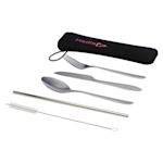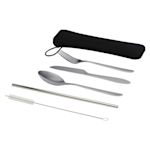 Lleva tus utensilios a cualquier parte con este kit de cubiertos portátil. Incluye tenedor, cuchillo, cuchara, pajita y cepillo en una bolsita con cremallera y asa de transporte.