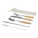Lleva tus propios utensilios dondequiera que vayas con este práctico kit de cubiertos. Incluye piezas de acero inoxidable con asas de madera de haya, todo guardado en una bolsita de algodón.