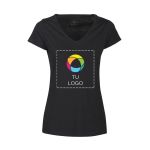 Esta camiseta personalizada de cuello de pico para mujer combina perfectamente con el uniforme de tu equipo por ser especialmente cómoda y suave. Personalízala con tu logotipo y haz que tu personal promocione tu marca cada vez que la usen.